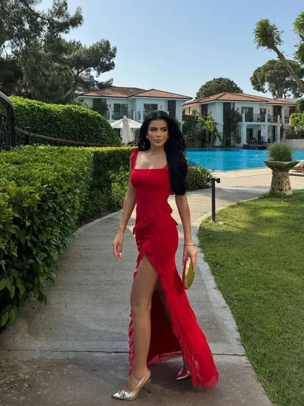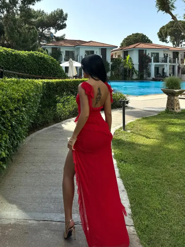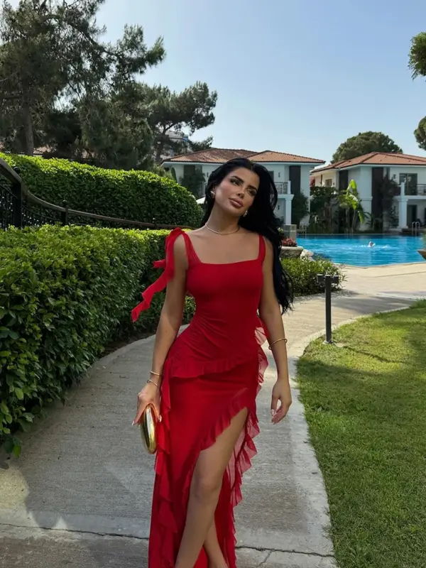 🔹 Dekolte: Bretele i duboki izrez na nozi