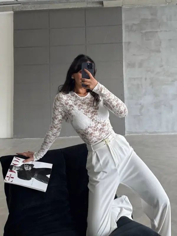 Ovaj elegantni i sofisticirani top od čipke je savršen izbor za svakodnevnu upotrebu ili specijalne prilike. Izrađen od visokokvalitetne rastezljive i providne čipke, pruža vam udobnost, a istovremeno daje seksi i zavodljiv izgled. Zbog svoje providnosti, preporučuje se da se ispod nosi odgovarajući komad odjeće, poput donjeg veša ili topa. Dolazi sa okruglim okovratnikom koji je savršeno prilagodljiv i dodaje dašak elegancije svakom izgledu. Njegova fleksibilnost omogućava da se lako prilagodi različitim oblicima tijela, čineći ga pogodnim za sve tipove figura.