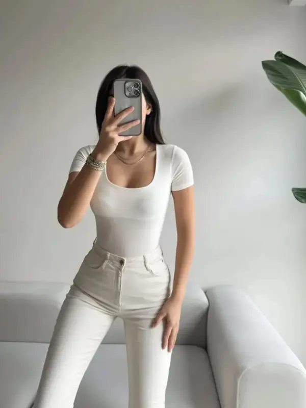 Ova rastezljiva basic crop majica s modernim kvadratnim izrezom savršen je dodatak za svakodnevne kombinacije. Jednostavnog dizajna, lako se uklapa s različitim stilovima – od ležernih basic outfita do slojevitih kombinacija. Zahvaljujući rastezljivom materijalu, majica pruža udobnost i odlično prianja uz tijelo, naglašavajući siluetu.