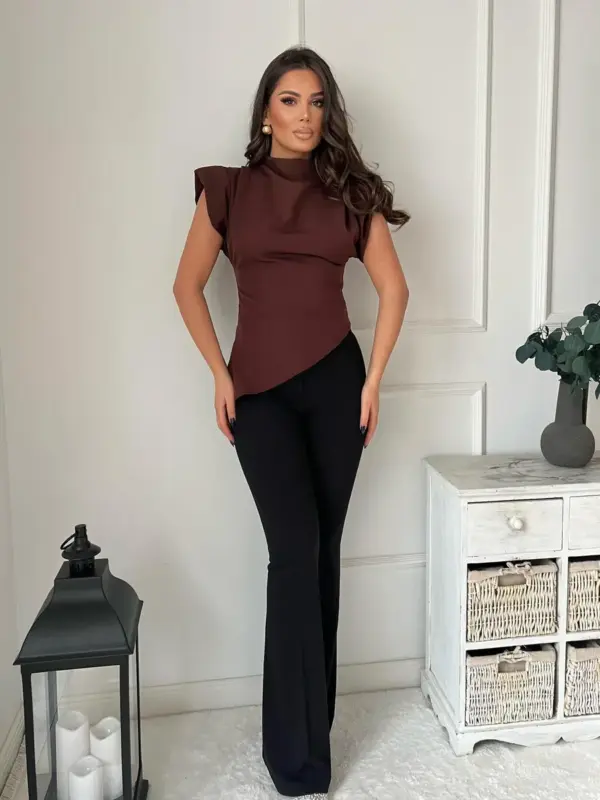 Ovaj elegantni top odiše sofisticiranošću zahvaljujući blagom nabiranju koje ističe figuru, dok spužve na ramenima daju strukturu i moderan izgled. Asimetričan donji porub dodaje dozu originalnosti, čineći ga idealnim izborom za posebne prilike, ali i stylish svakodnevne kombinacije.