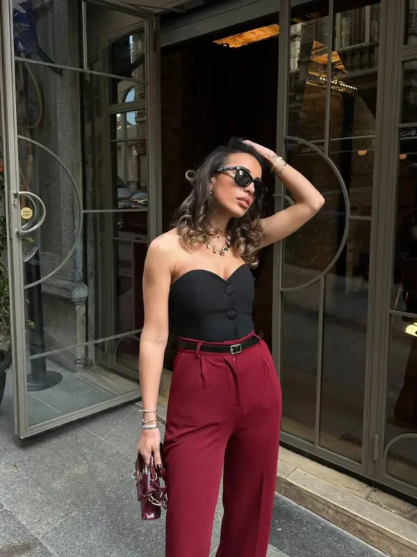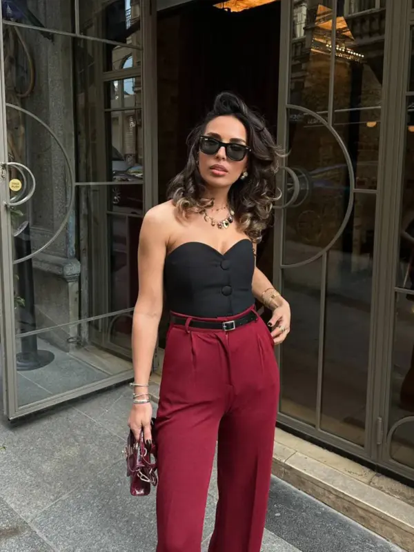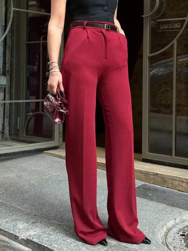Palazzo hlače visokog struka sa širokim nogavicama koje se blago šire prema dnu, pružajući elegantan i sofisticiran izgled. Savršene za formalne i poslovne kombinacije.