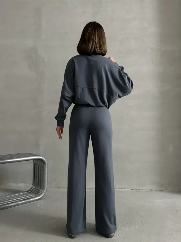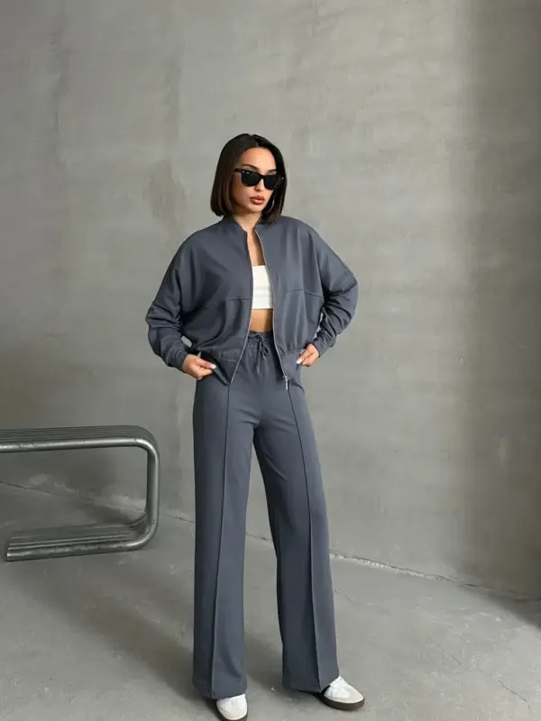 Ova dvodijelna trenerka sastoji se od gornjeg dijela – duksa sa zatvaračem (zipperom) u oversize kroju, koji pruža opušten i udoban izgled. Donji dio ima široke nogavice, sa dodatnom udobnošću zahvaljujući elastičnoj gumi u struku koja omogućava lako prilagođavanje. Idealna je za opuštene dnevne kombinacije ili lagane sportske aktivnosti.