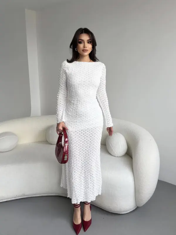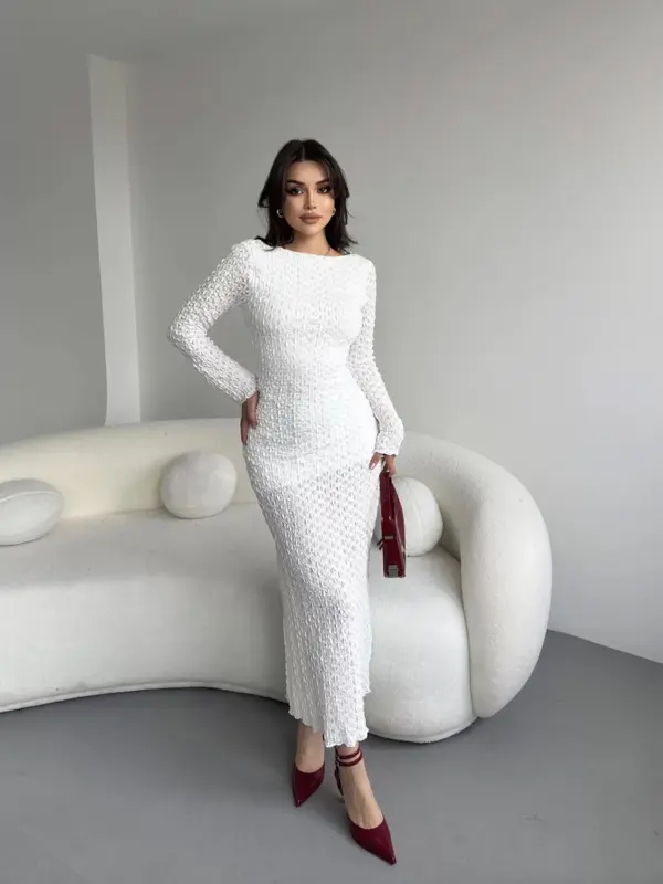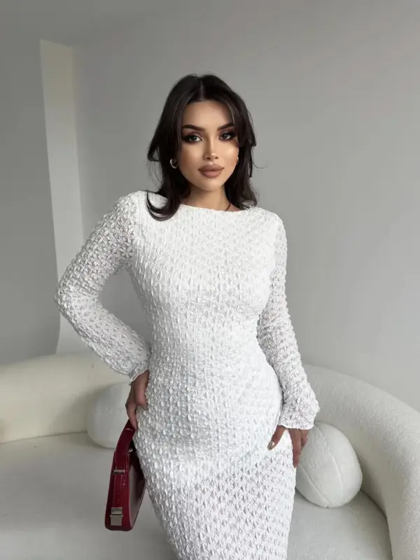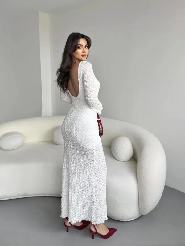 Ova uska i rastezljiva maxi haljina s dugim rukavima i otvorenim leđima prilagođava se figuri, ističući ženstvene linije. Napravljena od tkanine s teksturom, pruža sofisticiran i moderni izgled, idealan za različite prilike – od casual kombinacija do elegantnih večernjih izdanja.