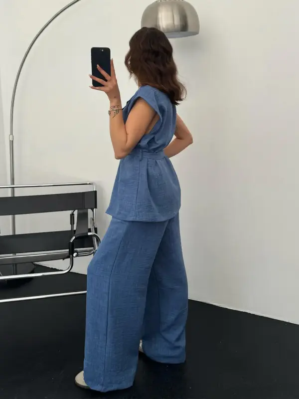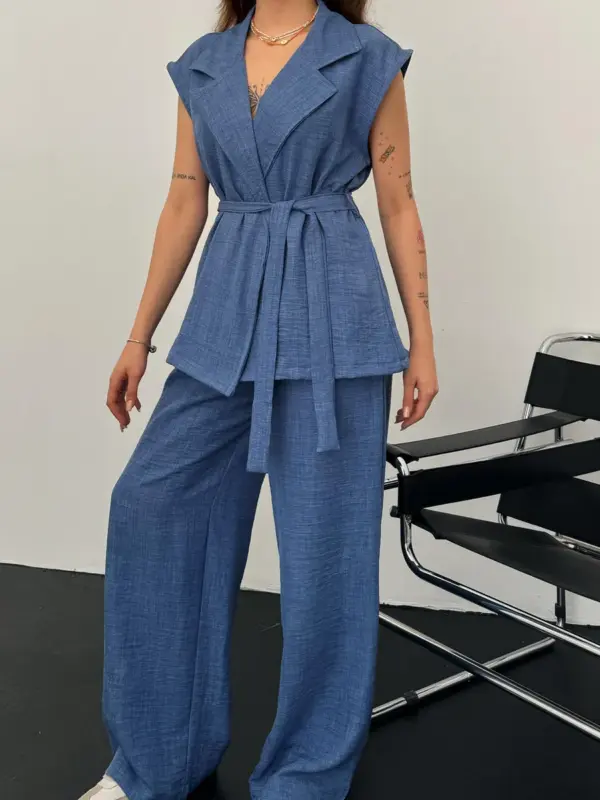 Ovaj dvodjelni set savršen je za toplije dane i ležerne outfite s dozom elegancije. Gornji dio je prsluk na vezanje, malo dužeg kroja, koji se može stilizirati na više načina. Donji dio su šalvare s gumom u struku, koje osiguravaju maksimalnu udobnost i lagan osjećaj na koži.