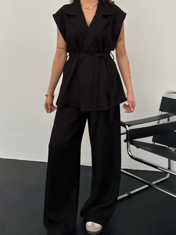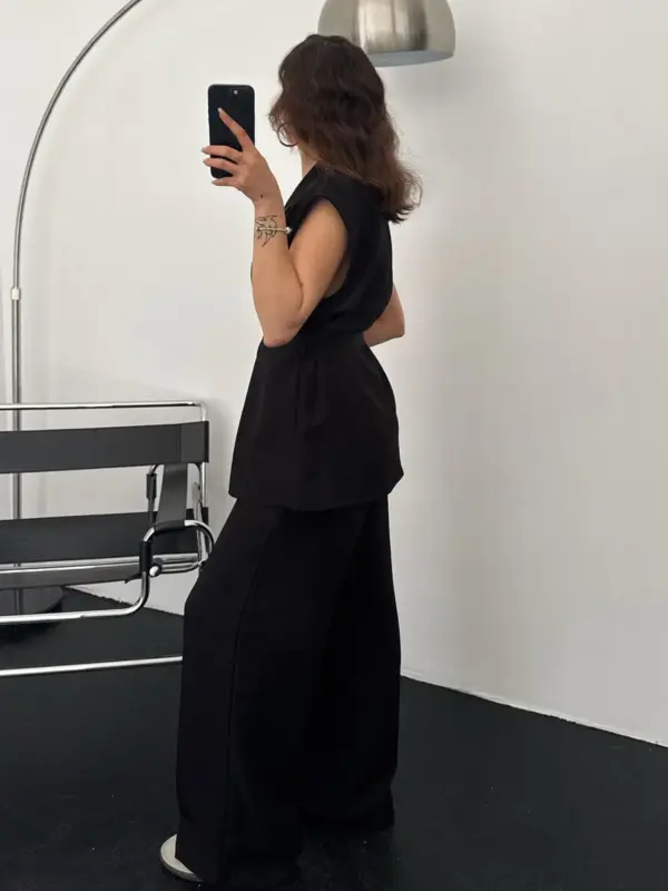 Ovaj dvodjelni set savršen je za toplije dane i ležerne outfite s dozom elegancije. Gornji dio je prsluk na vezanje, malo dužeg kroja, koji se može stilizirati na više načina. Donji dio su šalvare s gumom u struku, koje osiguravaju maksimalnu udobnost i lagan osjećaj na koži.
