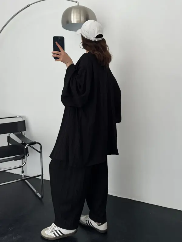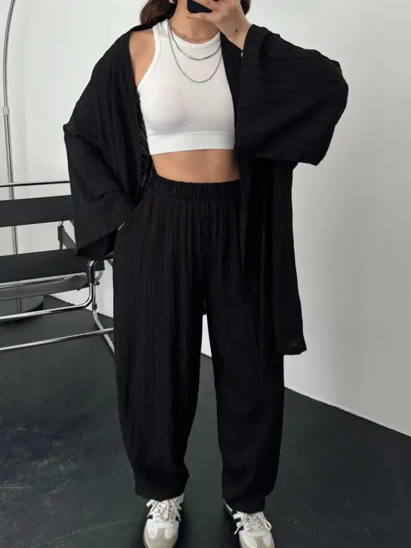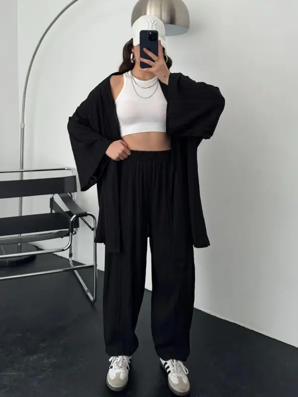 Pantalone imaju elastičnu gumu u struku koja se prilagođava figuri i omogućava maksimalnu udobnost, dok kimono svojim šišmiš rukavima i slobodnim krojem daje outfitu notu nonšalantnog stila.