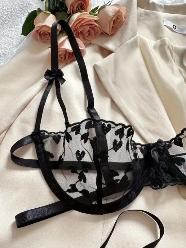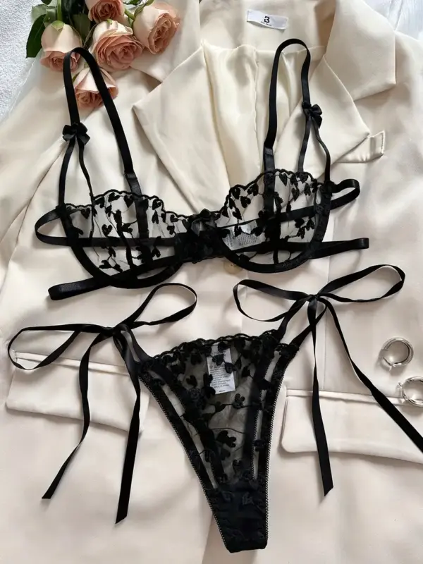 Dvodjelni lingerie set u kombinaciji mrežice i veza s naramenicama na vezanje u gornjem dijelu i podesivom širinom u struku isto u vidu vezanja na donjem dijelu. Upute za održavanje: pranje na 30°C ili ručno, ne sušiti u sušilici, ne peglati.