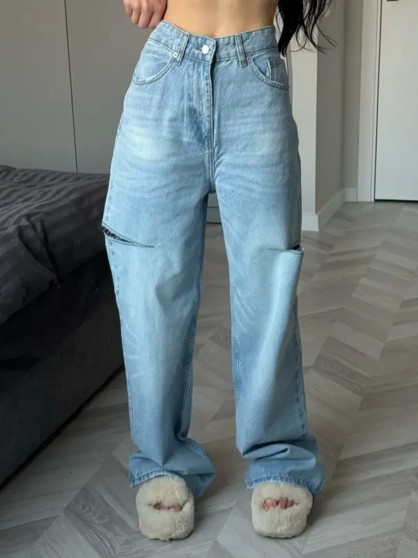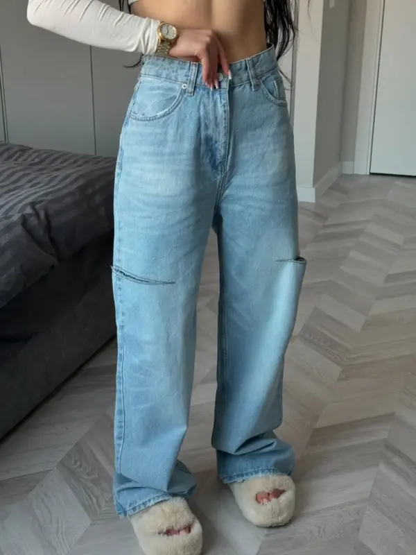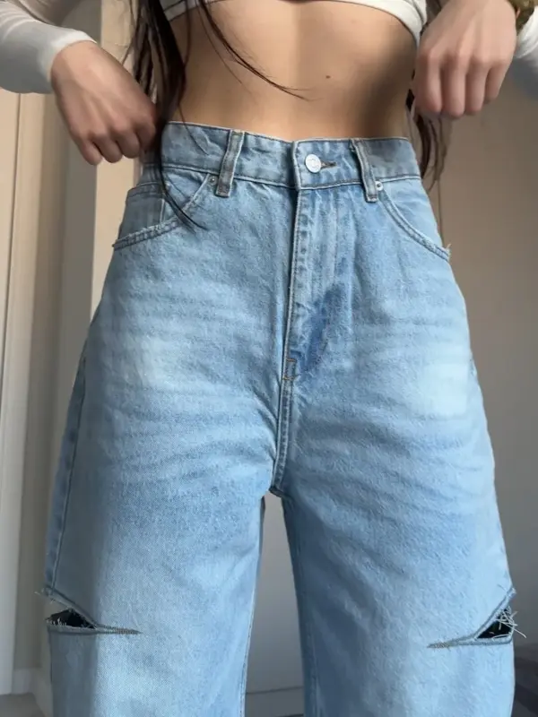 Jednostavne i trendi basic farmerice širokih nogavica sa bočnim prorezima, savršene za svakodnevne kombinacije. Visoki struk pruža udobnost i ističe figuru, dok prorezi daju moderan, ležeran izgled.
