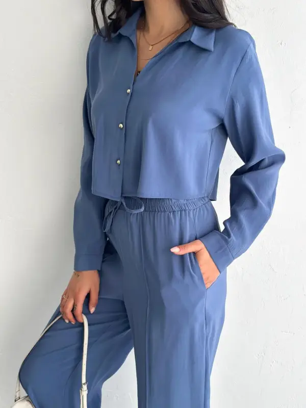 Dvodjelni ženski set – elegantna opuštenost s crop košuljom i širokim nogavicama 🌿