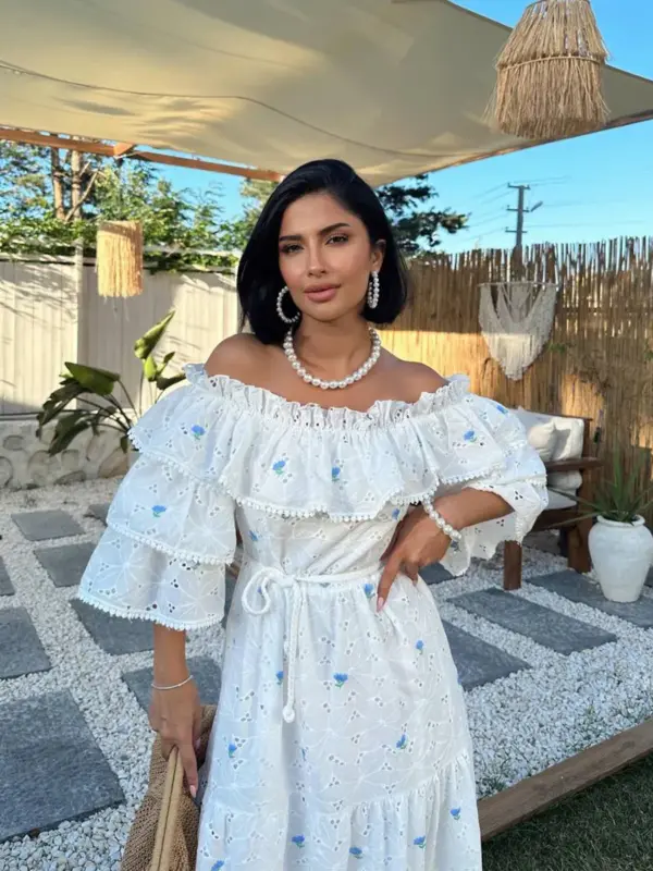 Romantična off-shoulder midi haljina – boho elegancija za ljetne dane 🤍🌸