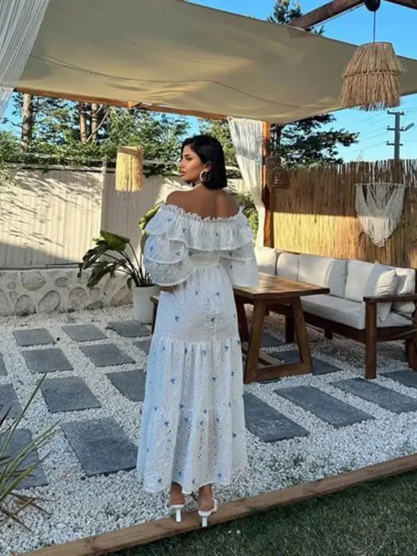 Savršena za ljeto, putovanja i sve opuštene, a elegantne prilike! Ova off-shoulder midi haljina izrađena je od laganog materijala s nježnim cvijetnim detaljima i čipkastim izvezenim uzorkom. Rukavi i gornji dio ukrašeni su volanima koji dodaju dozu romantike, dok podstava osigurava neprozirnost i udobnost.