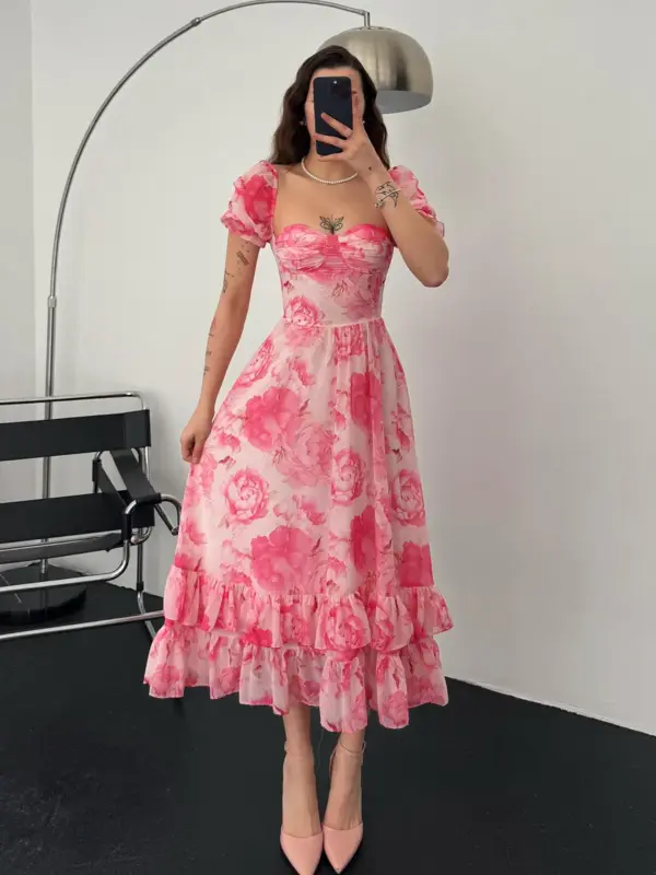 Ako tražiš haljinu koja izgleda kao da je izašla iz bajke, upravo si je pronašla! Ova midi haljina s cvjetnim printom i dvostrukim volanima pri dnu je oličenje ženstvenosti i profinjenosti.