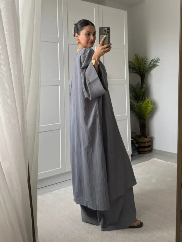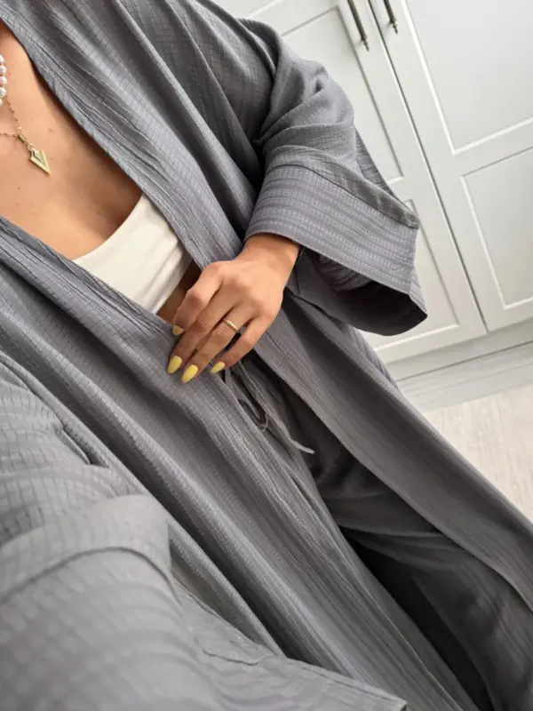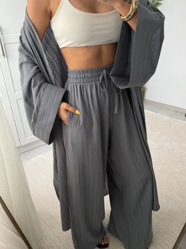 Ovaj lagani i prozračni komplet osmišljen je za sve koji vole udobnost, ali ne žele da žrtvuju stil. Gornji dio dolazi u formi lepršavog kimona sa širokim rukavima i opuštenim krojem, dok su hlače široke, visokog struka s elastičnim pojasom i špagom koji osigurava savršeno pristajanje.