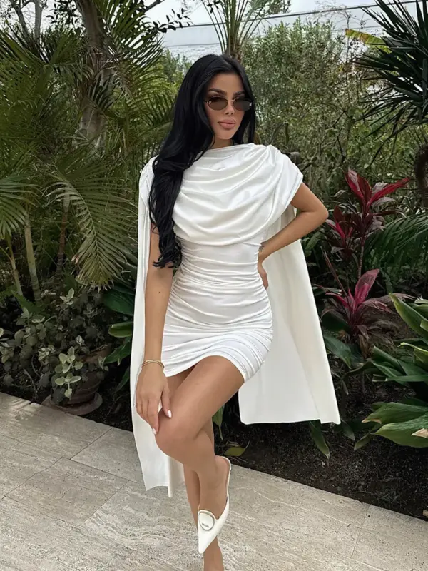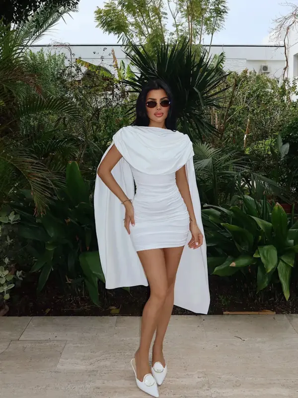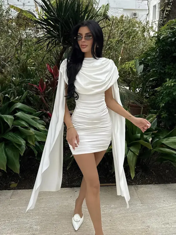Ova mini haljina s efektnim plašt rukavima je statement komad koji će privući sve poglede! Raskošna draperija oko ramena, naglašeni struk i pripijeni kroj savršeno oblikuju siluetu. Materijal je lagano rastezljiv i udoban za nošenje, dok zadnji dio otkriva leđa za dodatni “wow” efekat.