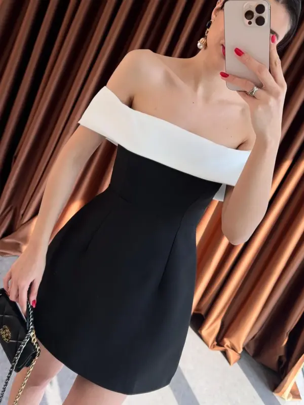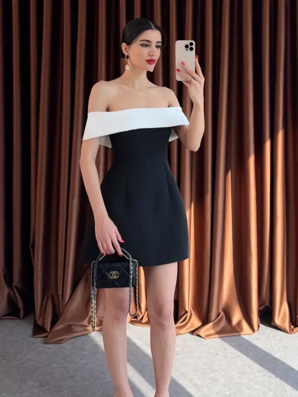 Crno-bijela klasika nikad ne izlazi iz mode – pogotovo kad je ovako profinjeno izvedena. Gornji dio haljine pada preko ramena u savršenom off-shoulder kroju, dok strukirani donji dio suptilno prati liniju tijela i širi se u ženstveni A kroj. Model je podstavljen za udobnost i bolju formu, a zatvara se diskretnim rajsferšlusom na leđima. Idealna za svečane prilike, večernje izlaske ili modne evente na kojima želiš ostaviti dojam.