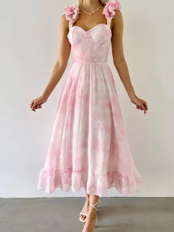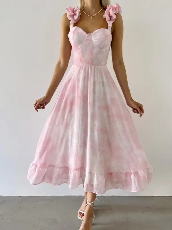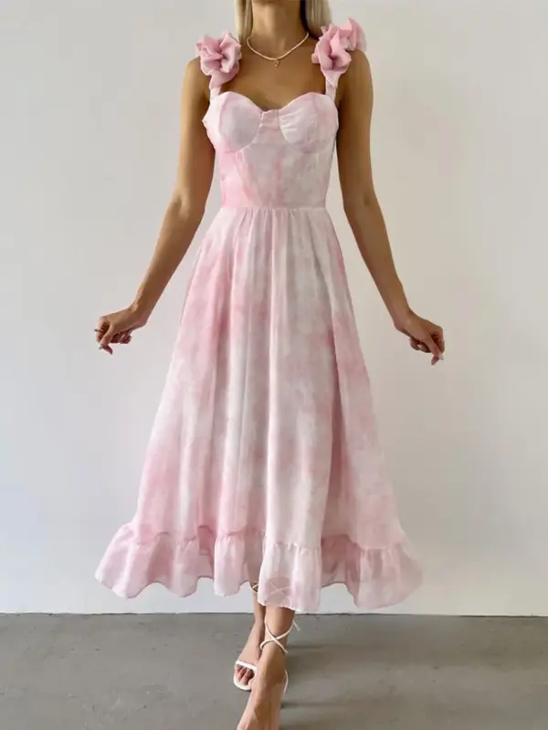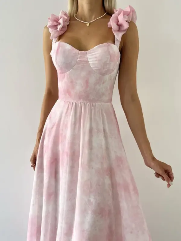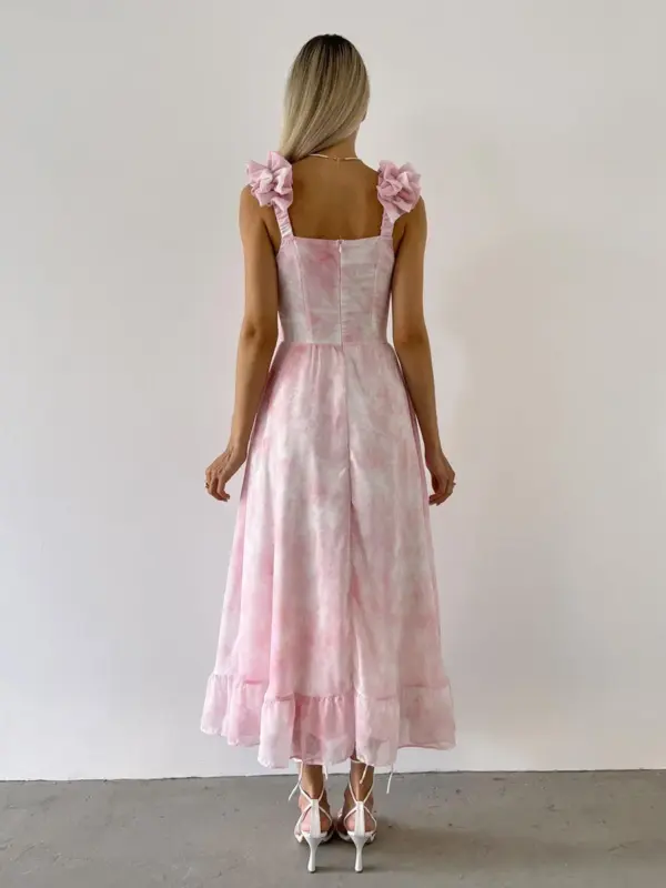 Haljina koja izgleda kao san – lagana, romantična i ženstvena! Izrađena od prozračnog materijala s nježnim roza-bijelim uzorkom, ova midi haljina ističe vašu siluetu uz korzetirani gornji dio sa umetnutim spužvama na ramenima i bretelama ukrašenim volanima. Donji dio haljine lepršavo pada stvarajući efektan pokret pri svakom koraku.