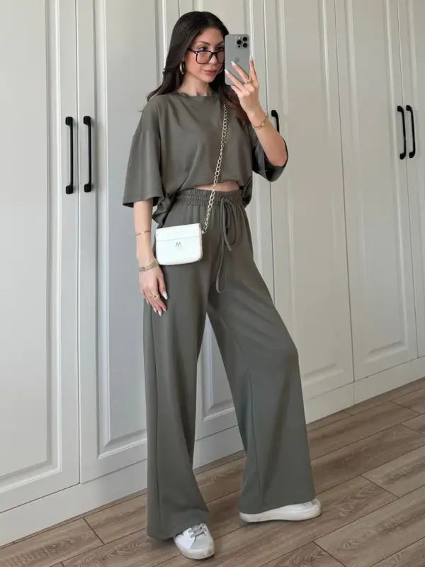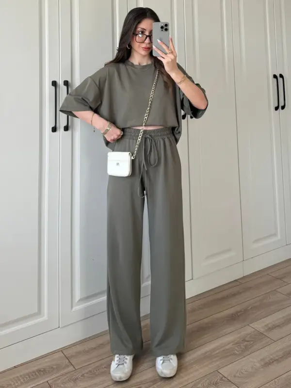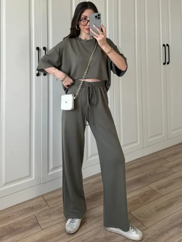 Ovaj oversized komplet donosi savršenu ravnotežu između udobnosti i minimalizma. Gornji dio se može nositi opušteno spušten ili uvučen za više definisanu siluetu. Donji dio dolazi s rastezljivim pojasom i ravnim nogavicama koje produžuju figuru, a lagani materijal čini ga idealnim izborom za svakodnevne obaveze, putovanja ili opuštene kafe s ekipom.