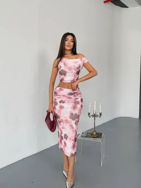 Zanosna kombinacija romantičnih tonova i modernog kroja — ovaj dvodijelni set donosi spoj sofisticiranosti i samouvjerenog stava. Gornji dio nosi se lagano preko ramena, nježno prati liniju tijela i savršeno se uparuje s visoko strukiranom suknjom dužine ispod koljena. Materijal podstavljen, s blago rastezljivom strukturom pruža udobnost, dok asimetrični kroj i print ostavlja upečatljiv vizualni dojam. Idealno za večernji izlazak, koktel zabave ili bilo koju priliku gdje želiš biti primijećena.