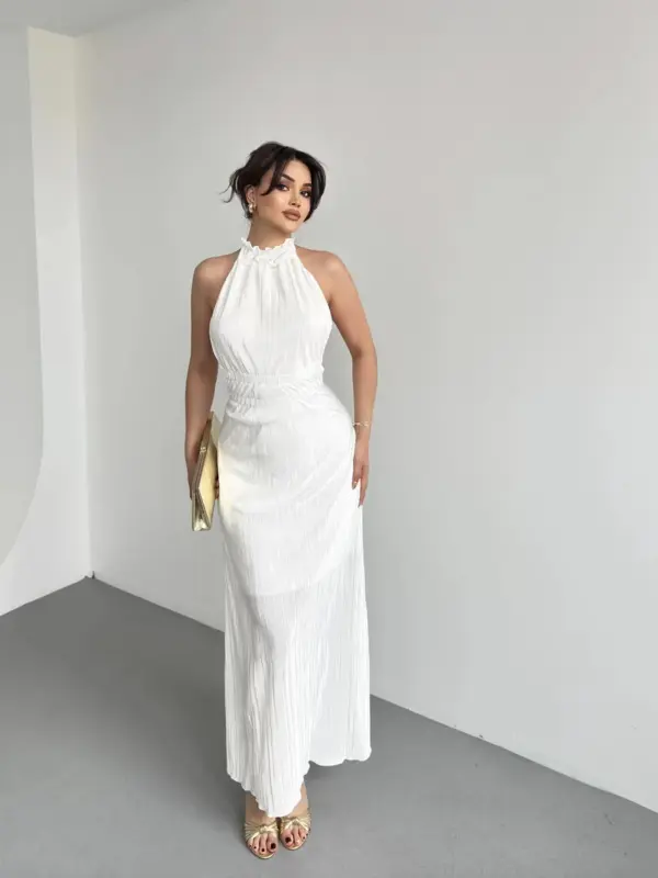 Ova maxi haljina plisiranog dizajna donosi dozu sofisticiranosti i ženstvenosti. Otvorena leđa i vezanje oko vrata stvaraju zavodljiv izgled, dok volan detalj oko vrata dodaje nježnu, romantičnu notu. Presjek u struku ističe figuru, a široki A-kroj pruža lepršavost i eleganciju pri svakom koraku.