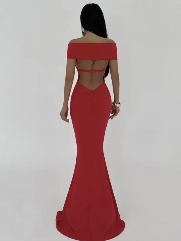 🔸 Kroj: off-shoulder + otvorena leđa + sirena donji dio