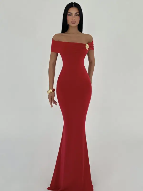 Upečatljiva, glamurozna i zavodljiva – ova haljina je stvorena da ostavi bez daha. Elegantni off-shoulder kroj otkriva ramena, dok pripijeni dizajn prati liniju tijela i završava u dramatičnom sirena kroju. Zlatni detalj u obliku školjke dodatno naglašava dekolte i donosi dašak luksuza, dok su leđa u potpunosti otvorena za maksimalan wow efekat. Idealna za gala večeri, crveni tepih ili sve prilike gdje želiš dominirati.