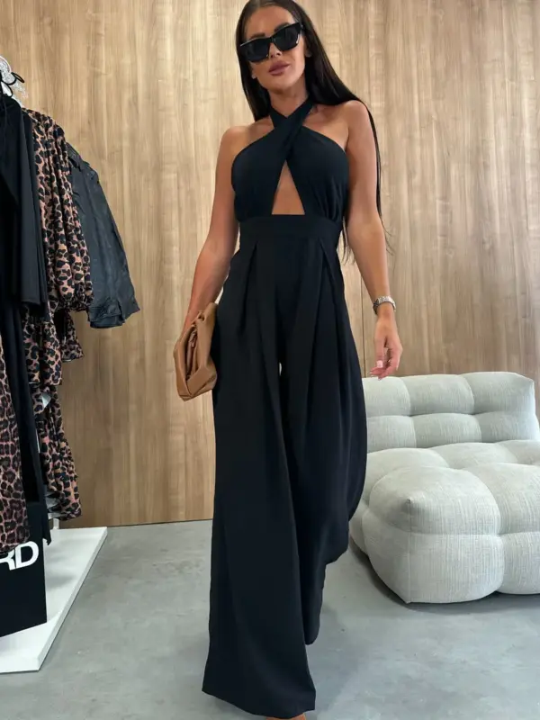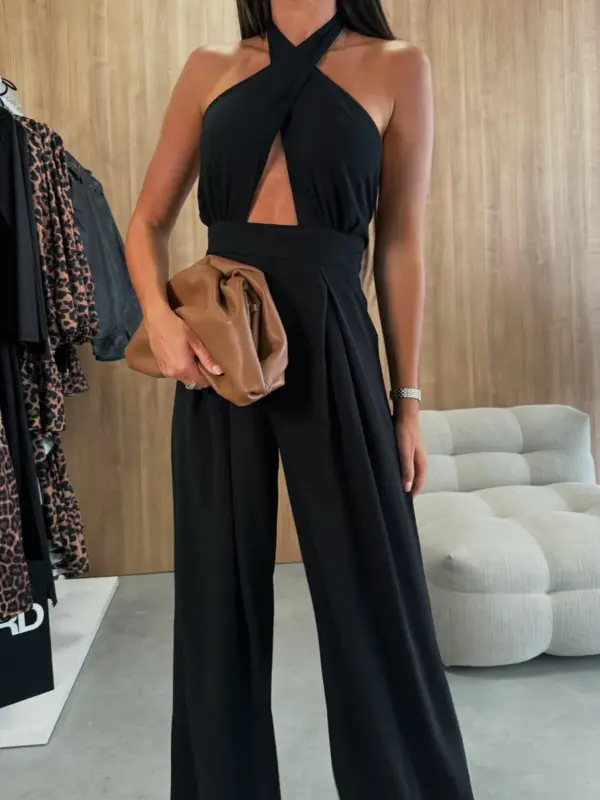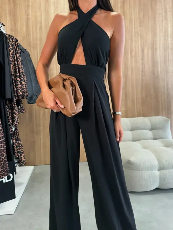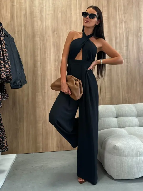 Ovaj kombinezon ističe figuru uz moderan i sofisticiran dizajn. Otvorena leđa daju mu posebnu dozu elegancije, dok prorez naprijed dodaje dašak smjelosti. Vezanje iza vrata i široke nogavice omogućavaju prilagodbu i dodatni efekat sofisticiranosti.