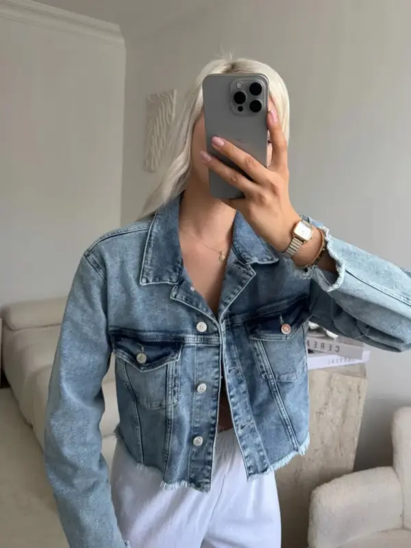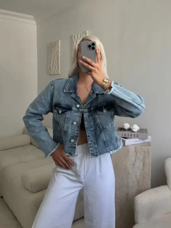 Ova rastezljiva crop teksas jakna savršeno pristaje modernim stilovima. Napravljena od denima obogaćenog elastinom, pruža izuzetnu fleksibilnost i slobodu pokreta. Kratka dužina ističe struk te se lako kombinuje s visokim strukom pantalona ili suknje.