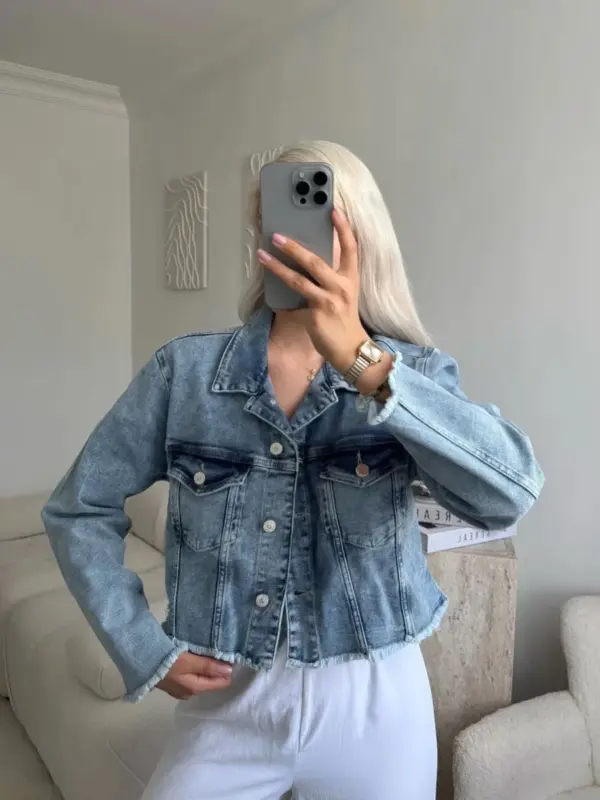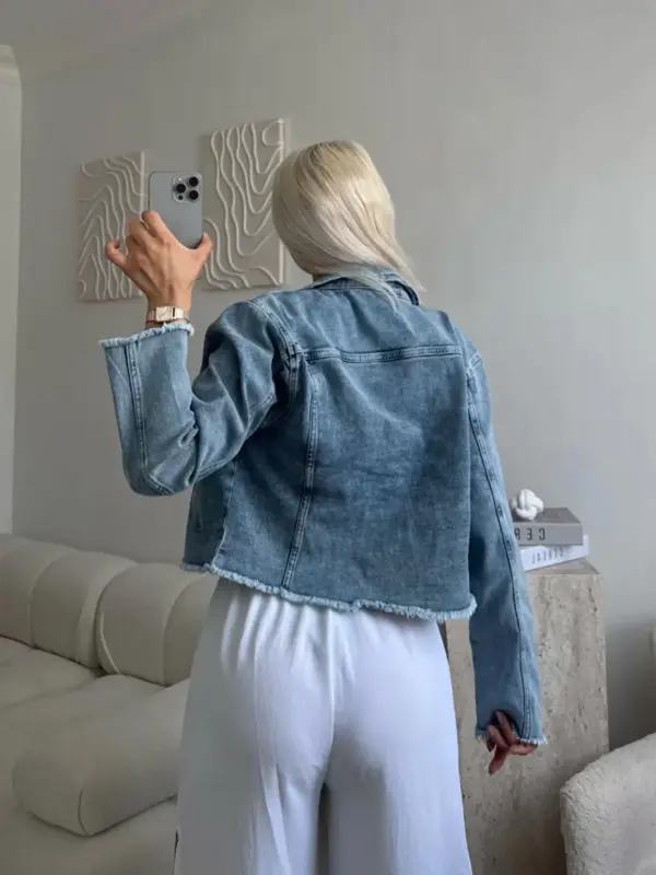 Porubi nisu obrađeni šavom, nego resicama, čime se postiže raw, urbani izgled koji naglašava individualnost. Idealna je za svaki dan, od jutarnjih sastanaka do večernjih izlazaka. Učinite svoj outfit posebnim uz ovu svestranu jaknu.