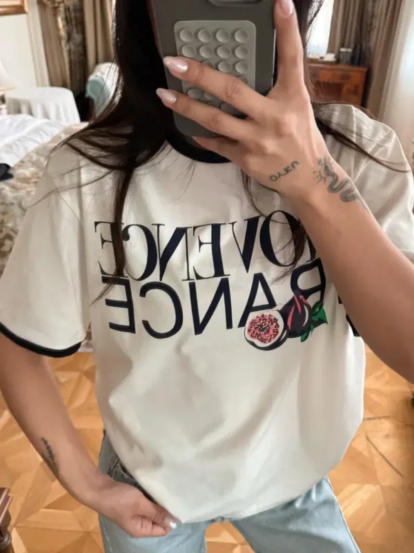 Upečatljiv print “Provence France” s ilustracijom smokve donosi svježinu i originalnost. Kontrastni tamni rubovi na kragni i rukavima dodaju sportsku notu. Idealna za ležerne kombinacije s trapericama, šortsevima ili suknjama.