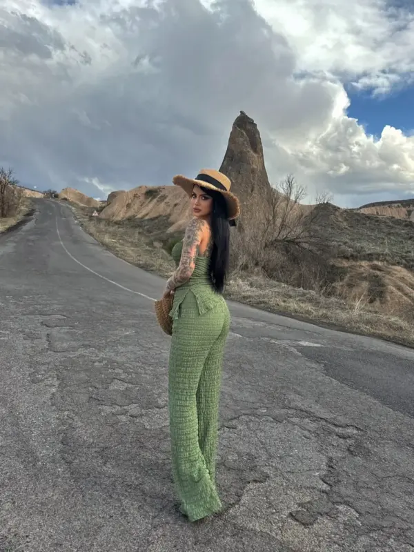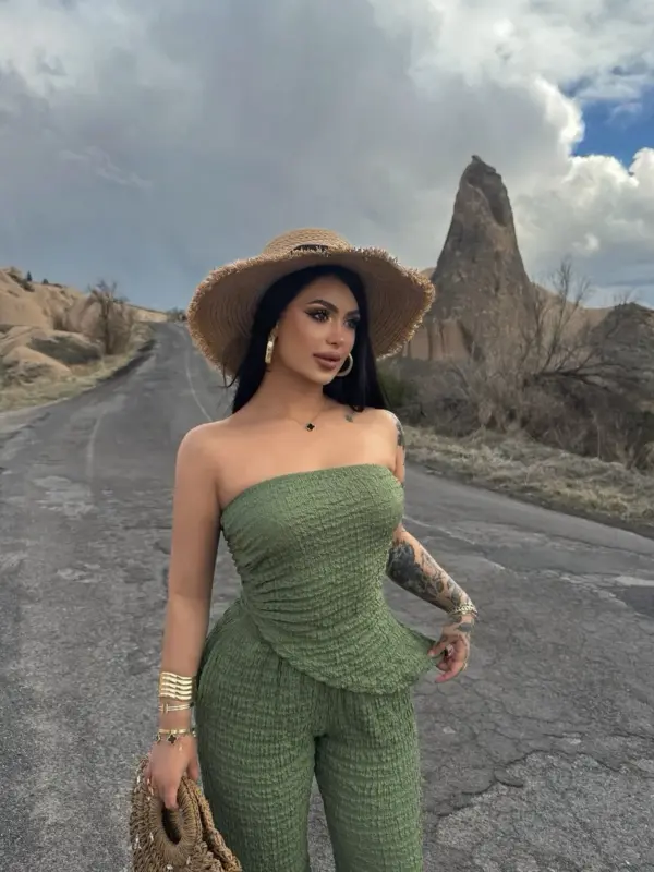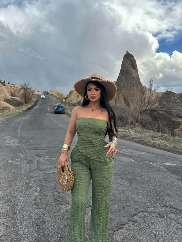 Bandeau top bez bretela savršeno ističe ramena, dok donji dio topa ima blagi preklop koji dodaje dinamičnost. Hlače su širokih nogavica s udobnom gumom u struku, pružajući maksimalnu slobodu kretanja. Ovaj set je idealan za ležerne ljetne dane, putovanja ili opuštene izlaske. Kombinujte ga sa sandalama, torbom od prirodnih materijala i šeširom za kompletan boho chic look.