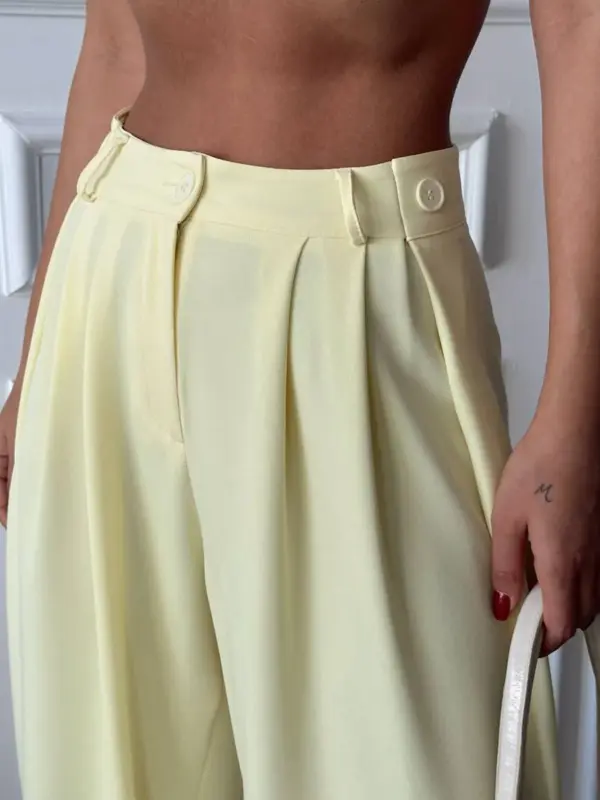 Hlače imaju detalje nabora na prednjoj strani i kopčaju se sprijeda dugmićima. Izrađene su od materijala koji lijepo pada i pruža osjećaj prozračnosti. Savršene su za ljetne dane, od casual kombinacija do malo sređenijih outfita s elegantnim topovima ili bluzama.