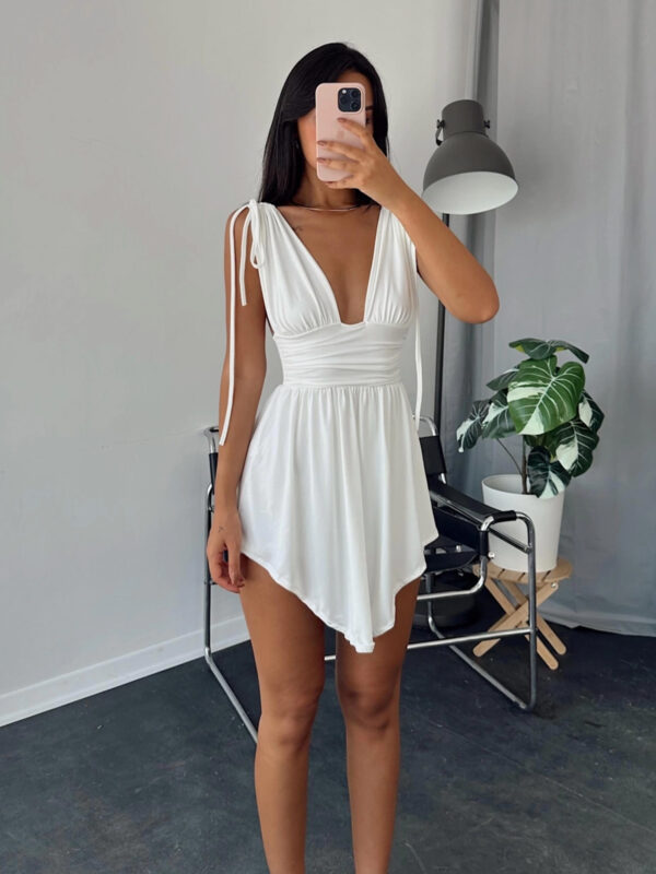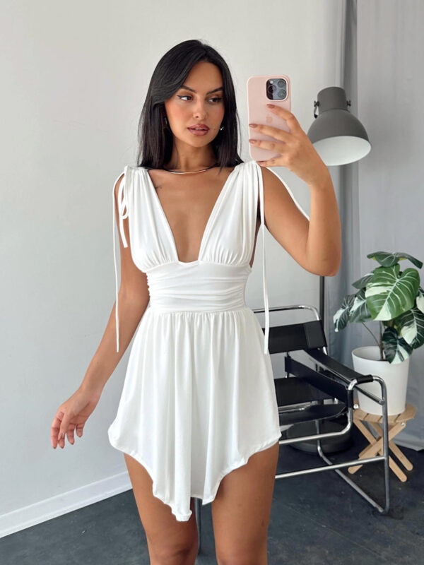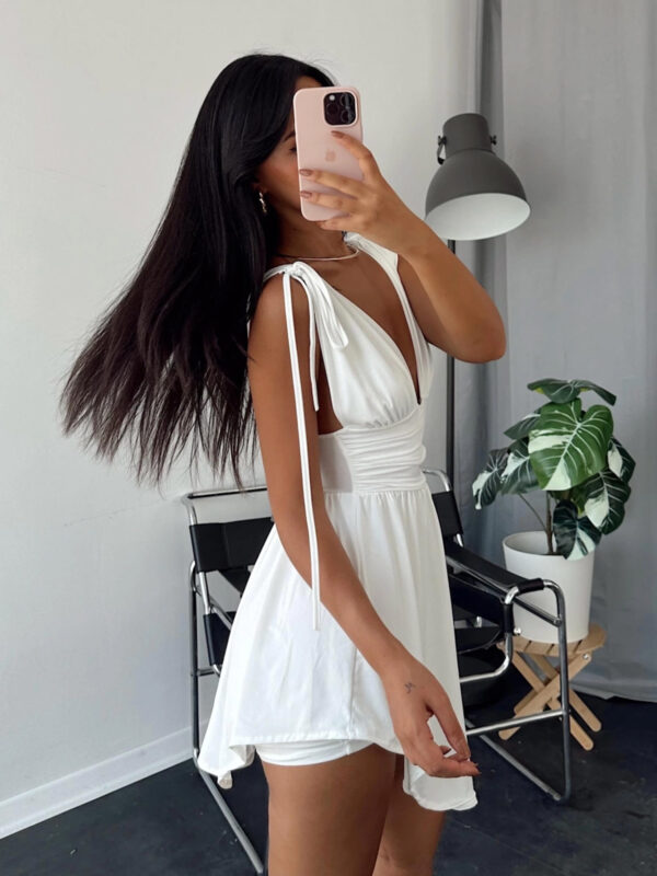 Ova romantična mini haljina je savršen izbor kada želite spojiti ženstvenost i udobnost! Duboki V-izrez i vezanje na ramenima daju joj poseban šarm, dok lepršavi donji dio skriva praktičan šorc ispod.