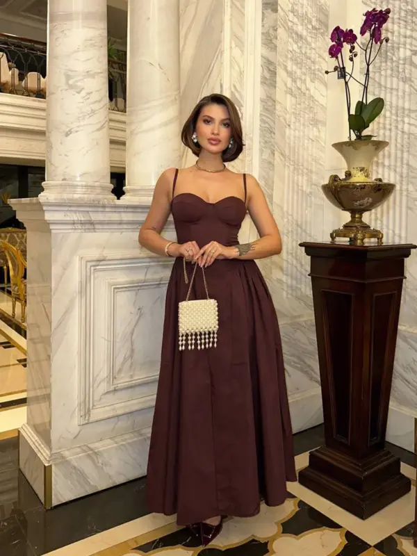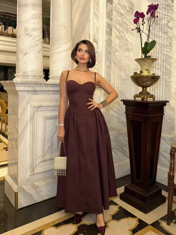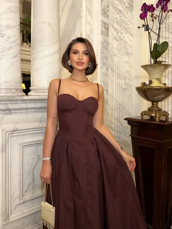 Zablistajte u ovoj elegantnoj midi haljini koja kombinira sofisticiranost i dašak drame! Kroj s korzet detaljem na gornjem dijelu lijepo oblikuje figuru i pruža podršku, dok puna suknja stvara raskošan i lepršav izgled. Haljina ima tanke, podesive bretele za savršeno pristajanje.