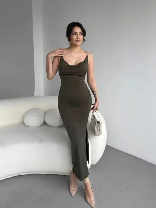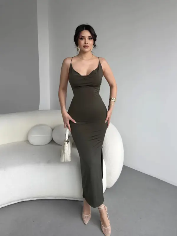 Ova elegantna midi haljina je savršen izbor za sve prigode gdje želite izgledati sofisticirano i privlačno! Drapirani dekolte i tanke bretele unose dozu glamura, dok uska silueta s visokim prorezom na nozi dodaje seksepil i dramatičnost.