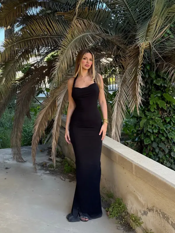 🔹 Kroj: Maxi haljina na jedno rame, uska silueta s blagim širenjem prema dnu