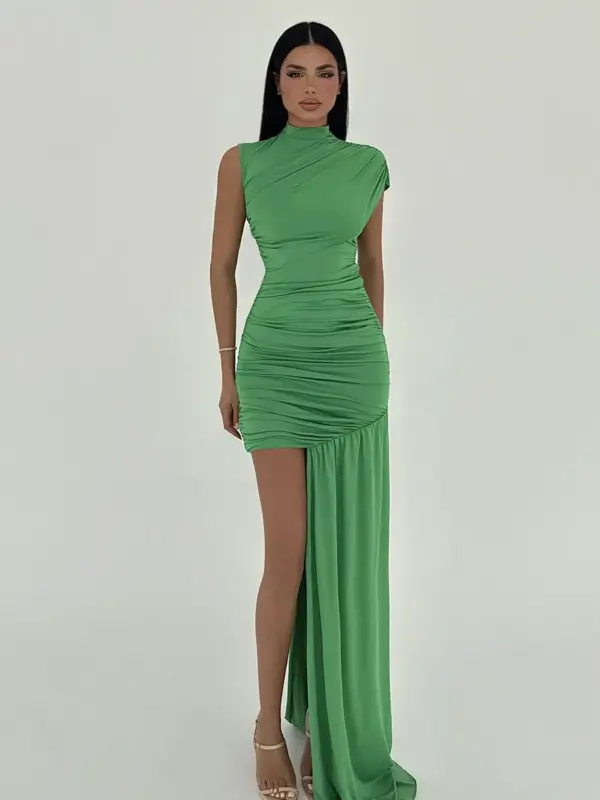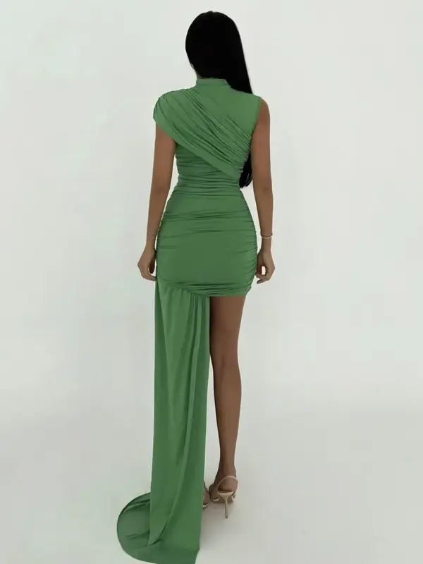Upoznaj haljinu koja donosi balans između zavodljivosti i sofisticiranosti. Asimetričan kroj s jednim ramenom i dramatična drapirana tkanina stvaraju siluetu koja oduzima dah. Mini dužina s dodatkom dužeg bočnog sloja daje dozu teatralnosti, dok boja odiše luksuzom i samopouzdanjem. Ovo je haljina za večeri kad želiš da se osjećaš nepobjedivo.
