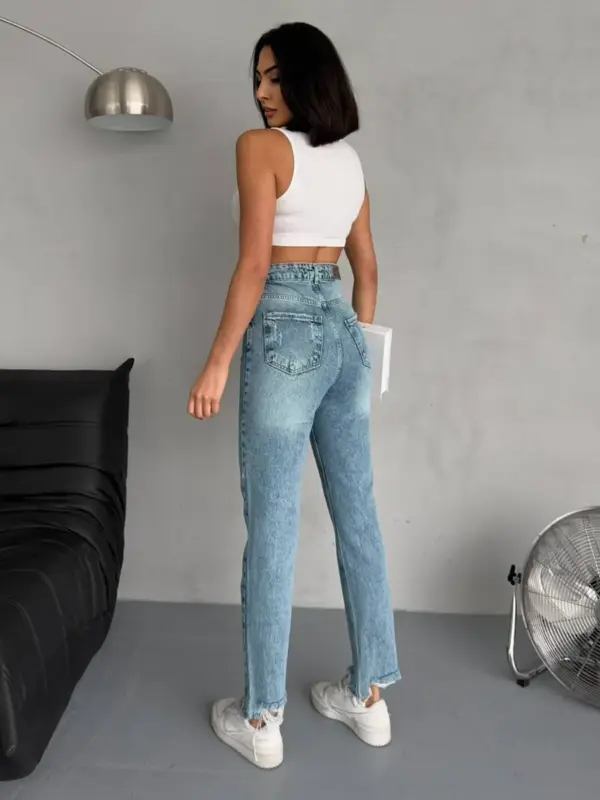 🔹 Kroj: Mom fit, visoki struk, ravne nogavice
