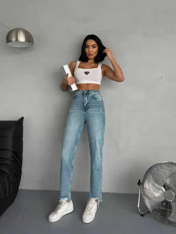 Ove mom jeans farmerke su savršen spoj udobnosti i stila – idealne za ležerne outfite tokom cijele godine. Visoki struk i ravni kroj ističu siluetu na suptilan način, dok blago ispran denim i poderani rubovi dodaju modernu, opuštenu notu. Lako se kombinuju s topovima, košuljama ili blejzerima za chic i effortless izgled.