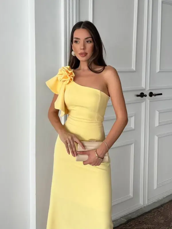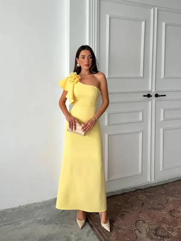 🔹 Kroj: Duga haljina, jedno rame, ravni kroj suknje