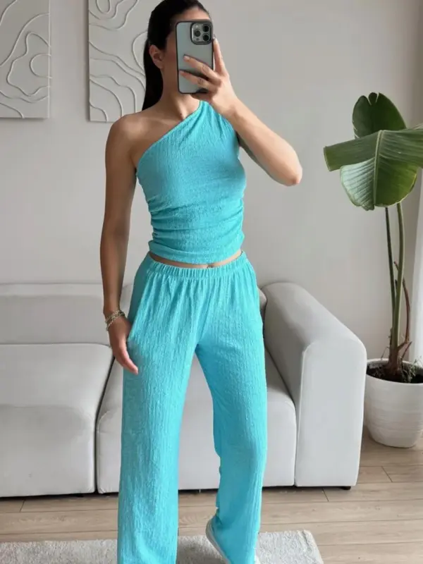 Ako tražiš komad koji savršeno balansira udobnost i stil – upravo si ga pronašla. Ovaj dvodijelni set od mekanog, teksturiranog materijala stvoren je za svakodnevne modne pobjede. Top s asimetričnim, jedno-ramenim izrezom donosi trendi momenat, dok široke pantalone s elastičnim pojasom oblikuju siluetu i pružaju maksimalnu udobnost, bilo za gradske kafe, vikend bijeg ili spontani photoshoot.