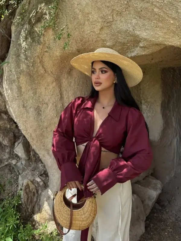🔹 Kroj: Crop košulja na preklop, dugi puf rukavi