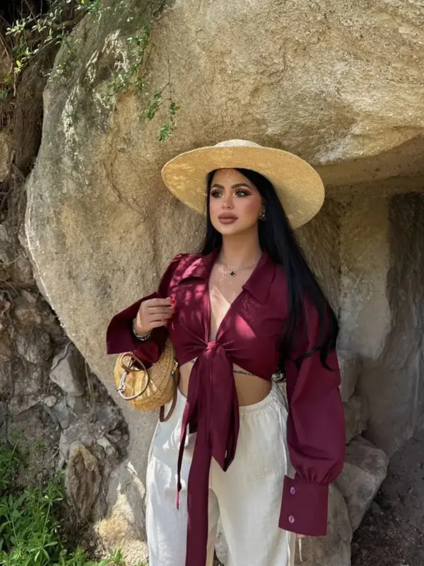 Ova šik košulja je savršen komad za postizanje romantičnog i trendy looka! Klasična košulja dobila je moderan zaokret preklopnim dizajnom i vezanjem sprijeda. Dužina je crop, idealna za kombiniranje s donjim dijelovima visokog struka.
