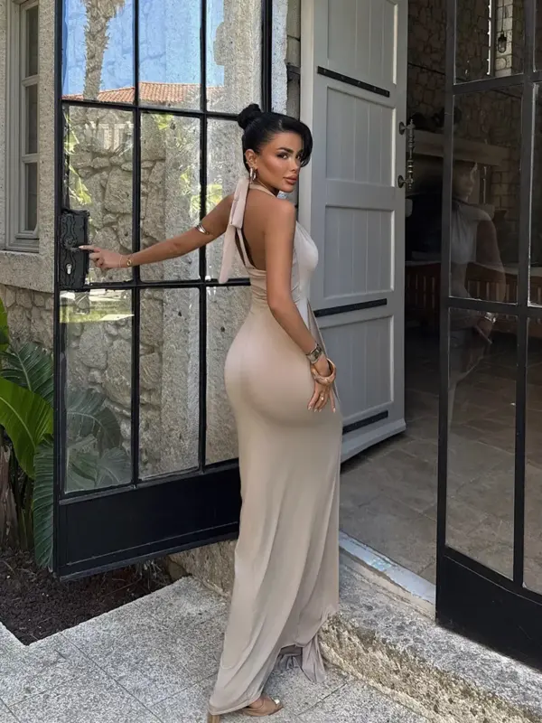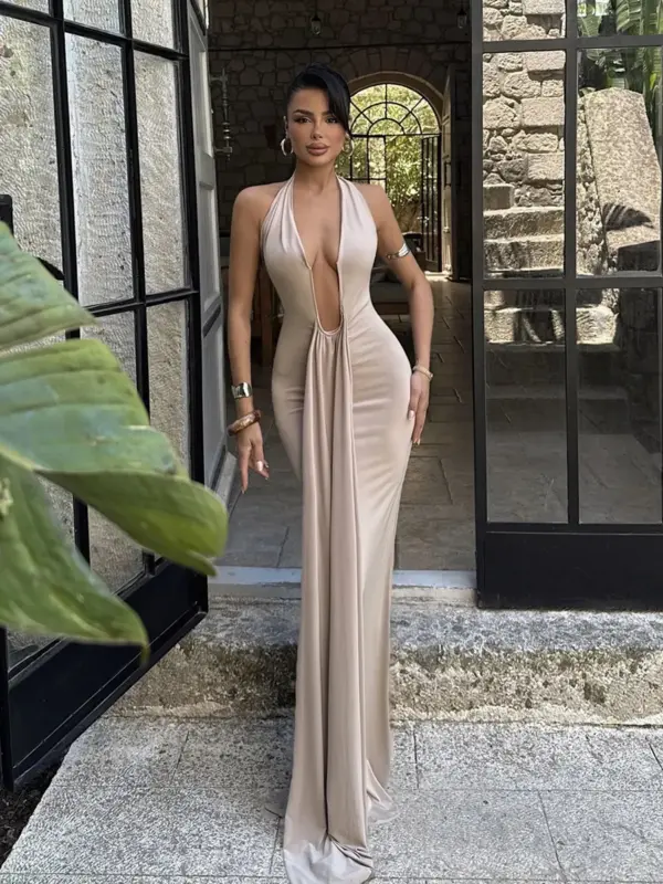 🔹 Dekolte: Duboki otvoreni dekolte, halter stil