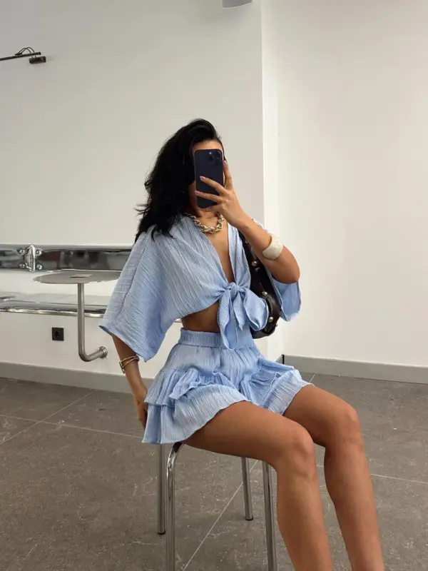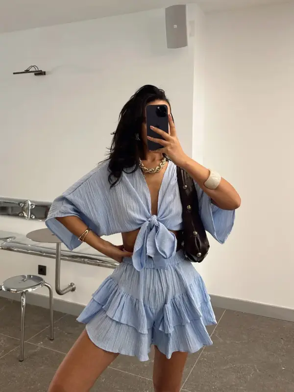 Crop top ima duboki V-izrez i veže se sprijeda, omogućavajući vam da prilagodite kroj. Mini šorc s volanima ima udobnu gumu u struku i donosi razigranost. Ovaj set je idealan za opuštene šetnje gradom, ljetne zabave ili odmor.