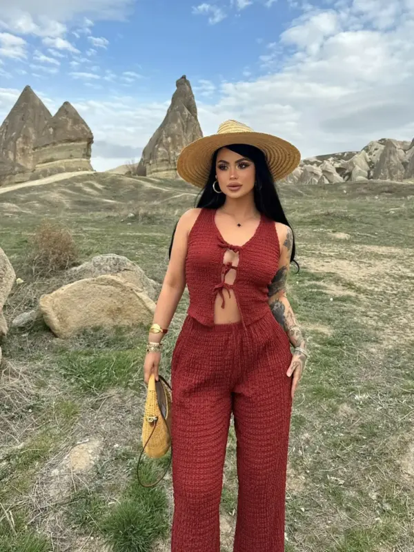 Crop top ima V-izrez s vezanjem sprijeda, što omogućava prilagođavanje dekoltea. Hlače su širokih nogavica, pružajući udobnost i lepršavost. Ovaj set je idealan za opuštene dane, putovanja ili casual izlaske. Lako se kombinuje s sandalama ili patikama.