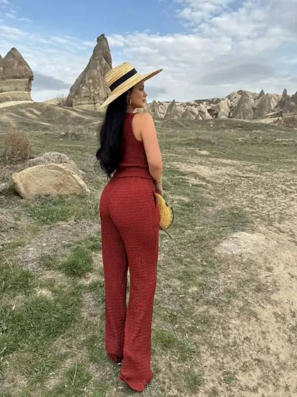 Ovaj udoban pleteni set je savršen izbor za ležeran i trendi izgled! Sastoji se od crop topa bez rukava i širokih hlača, oba izrađena od pletenog materijala s teksturom.