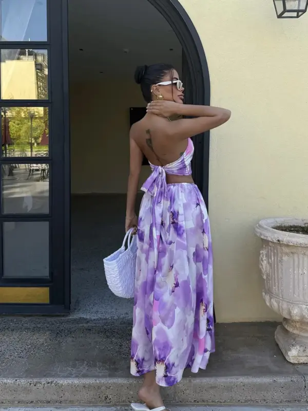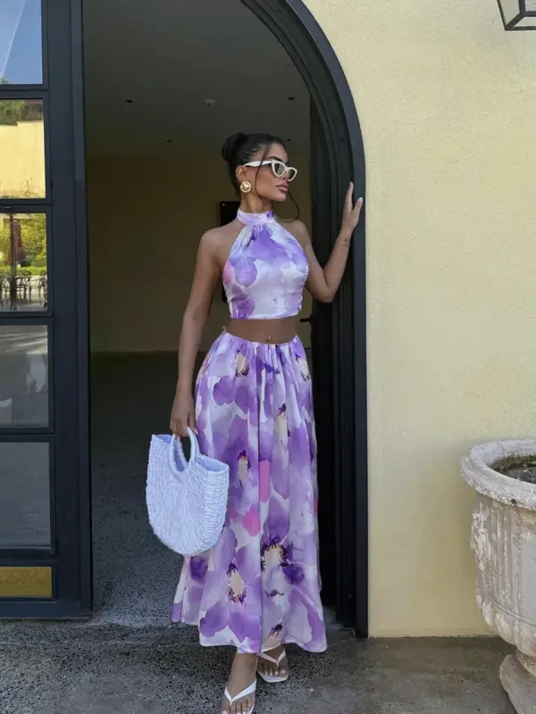 Ovaj predivni dvodijelni set je savršen izbor za ljetne dane i večeri kada želite izgledati vibrantno i romantično! Set se sastoji od halter crop topa i lepršave maxi suknje, oba s upečatljivim cvjetnim printom u nijansama ljubičaste.