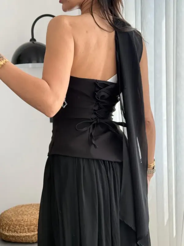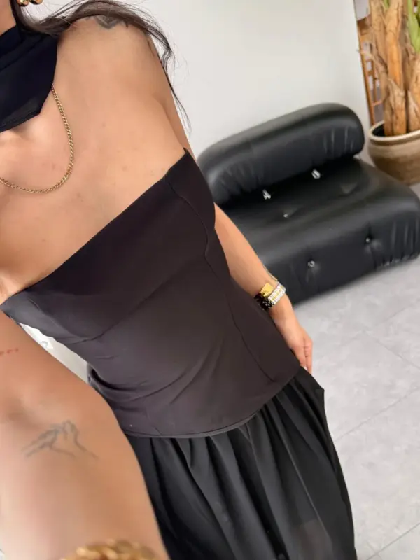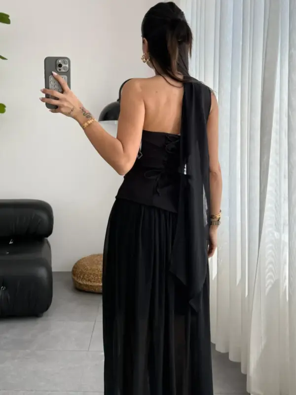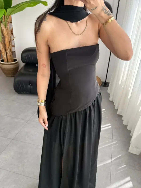 🔹 Kroj: Maxi haljina, bez bretela, korzet gornji dio, otvorena leđa, lepršav donji dio s prorezom, šal uz haljinu