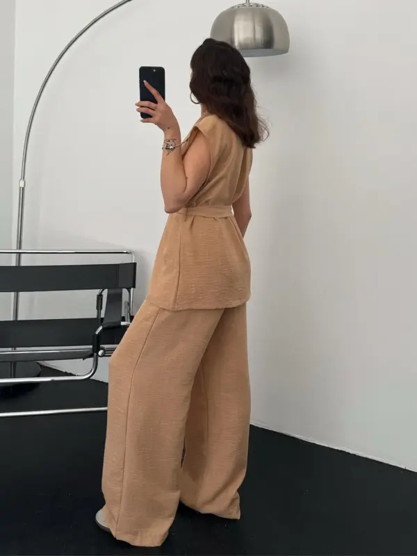 Ovaj dvodjelni set savršen je za toplije dane i ležerne outfite s dozom elegancije. Gornji dio je prsluk na vezanje, malo dužeg kroja, koji se može stilizirati na više načina. Donji dio su šalvare s gumom u struku, koje osiguravaju maksimalnu udobnost i lagan osjećaj na koži.