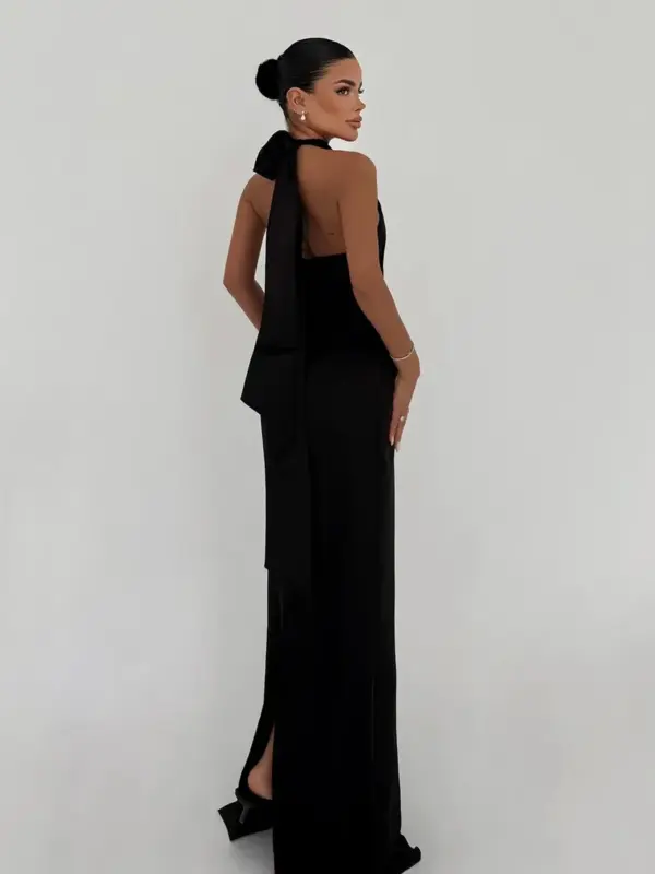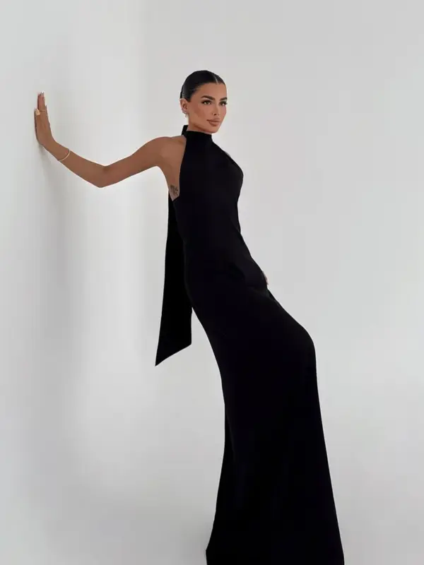 Elegantna maxi haljina izrađena od glatkog satenskog materijala koji pruža sofisticiran i luksuzan izgled. Haljina ima ravni kroj koji ističe figuru, dok otvorena leđa i vezanje iza vrata dodaju dozu zavodljivosti. Dizajn je savršen za svečane prilike ili večernje izlaske.